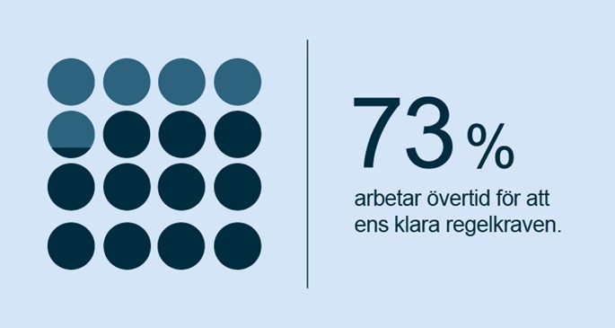 I arbetet med regelefterlevnad upplever 71 procent av de finansanställda svårigheter att hinna med sina arbetsuppgifter under ordinarie arbetstid. Nästan varannan svarande upplever detta i hög eller mycket hög grad. 73 procent svarar att det förekommer att de jobbar övertid för att hinna slutföra dokumentationen enligt regelkraven. För 20 procent händer detta ofta.